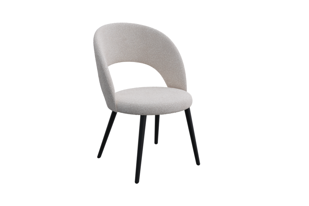 A modern beige cushioned chair with a rounded backrest and dark wooden legs against a black background.